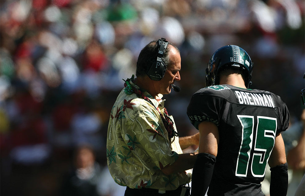 Glory days: University of Hawaii former football coach June Jones and quarterback Colt Brennan strategize during a game against USC at Aloha Stadium in 2005. “The best thing I liked was being able to tailgate,” says Viela of the UH games. “We always had a regular area right by the entrance—and then when Colt Brennan started to play, it was so crowded we ended up parking in Pearl Harbor.” PHOTOGRAPH BY KIRK LEE AEDER