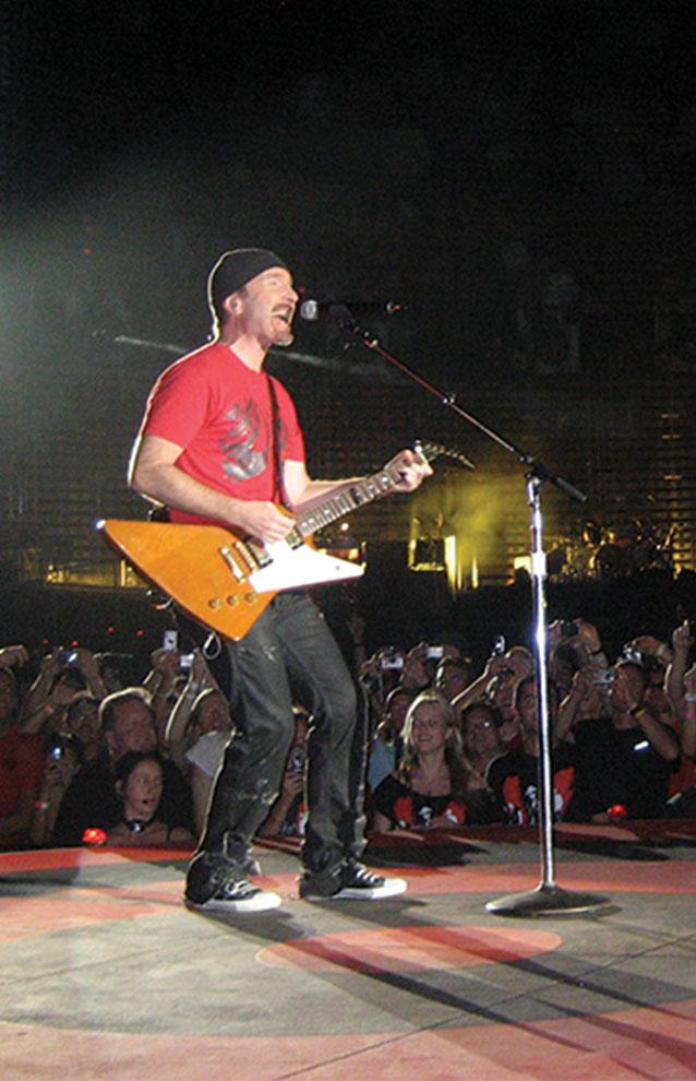 (LEFT) Most of the country knew Aloha Stadium as the home of the NFL’s Pro Bowl for thirty-four years, starting in 1980. Here, the Cardinals’ Larry Fitzgerald catches a touchdown pass in the 2009 Pro Bowl. PHOTOGRAPH BY KIRK LEE AEDER (RIGHT) U2 performing in 2006; Bruno Mars broke the Aloha Stadium attendance record set by U2 with three sold-out 2018 concerts in his hometown of Honolulu.