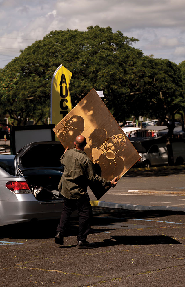 On a hot March morning, pieces of Aloha Stadium lie on the asphalt like items at a yard sale: two pay phones, rows of orange stadium seats, concessions signs, section signs, bathroom signs, five-foot-tall photos of University of Hawaii football players and tiny T-ball players that used to hang over the entrances to the stands. At the box office, online bidders pick up their winnings: six-inch squares of turf, 1996 Pro Bowl programs, flyers from the 2018 Snoop Dogg and Cardi B concert.