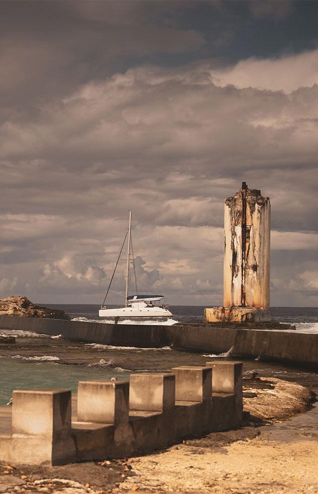Makatea has been a world-class rock climbing destination for only about five years. Before that it was a hub for the phosphate mining industry. We motor up to the remains of Temao Harbor, once a bustling seaport for shipping the 11.5 million tons of phosphate extracted from Makatea between 1906 and 1966, most of it for fertilizer to replenish the depleted soil of Europe and the United States, and later Japan’s rice fields that had been ravaged by World War II. With only three moorings and a channel too narrow and shallow for our boat, we anchor outside the harbor, staring at the eerie ruins of an empire. Steel turret-like structures rot away next to other deteriorating machinery. On shore, we spot a couple of men beside a Hilux pickup truck parked among the ruins next to a pavilion with breeze-block walls.