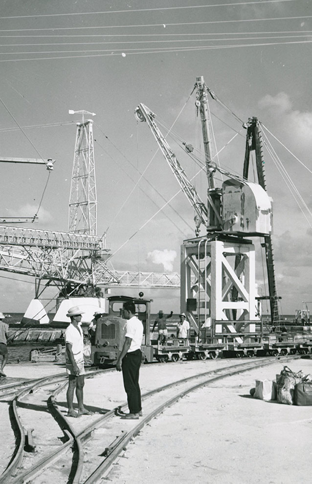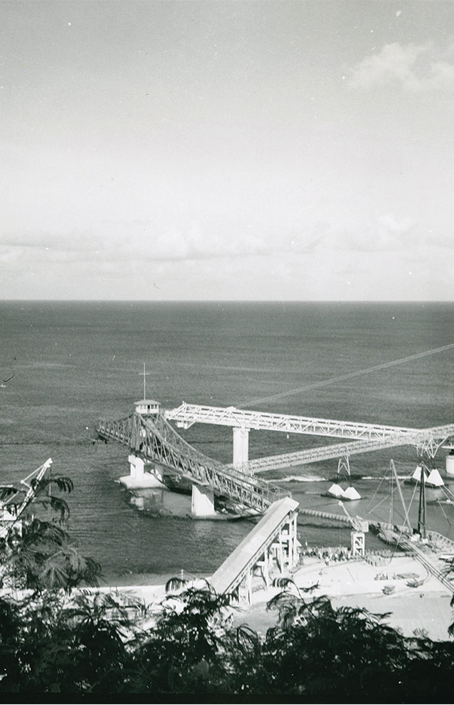 (LEFT) After phosphate was discovered on Makatea in 1906, it became a hub of a global mining industry. In the mid-1950s, a gigantic mobile gateway called “the grasshopper” (seen here) was constructed at Makatea’s port of Temao to deliver ore directly from a train to cargo ships. PHOTO COURTESY OF LOUIS MOLET / TAHITI HERITAGE. (RIGHT) Temao as it looks today. When phosphate mining ended in 1966, the primary driver of the economy on Makatea—and a major source of revenue for French Polynesia—went with it. The population dropped from three thousand to less than a hundred almost overnight.
