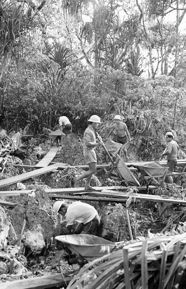 (LEFT) Dangerous excavations: Phosphate miners on Makatea in 1962 cart wheelbarrows loaded with phosphate sand along narrow footbridges spanning deep, limestone-walled pits. PHOTO COURTESY OF LOUIS MOLET / TAHITI HERITAGE. (RIGHT) Smith navigates the edges of the now empty pits, some more than a hundred feet deep. “It’s kind of eerie with all the old, decrepit buildings and rusted machinery,” says Johnson. “Hard to believe that at one time this island had more infrastructure than Papeete on Tahiti.”