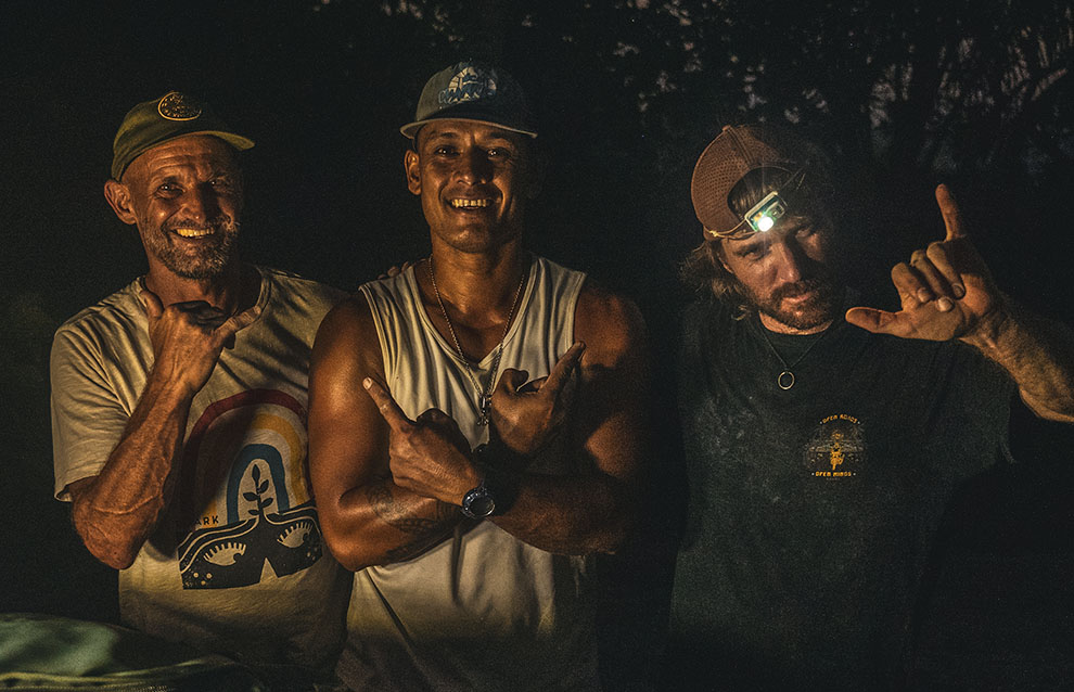 Climbing has been a “boom, like a big tank of oxygen for the community,” says Heitapu Mai, the head of Club Makatea Escalade (seen at center with Smith and Johnson). “Now Makatea is somehow known around the world. That was my goal.”