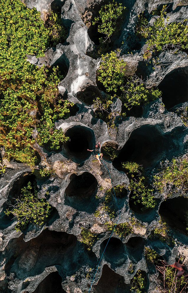 “It’s pretty surprising to find excellent climbing like this in such an unlikely spot,” says Johnson, seen here with Smith preparing to climb. “It is so unlike all the islands surrounding it. It’s flanked by steep one- to three-hundred-foot limestone cliffs, whereas the other islands are merely sand atolls, barely above sea level.”